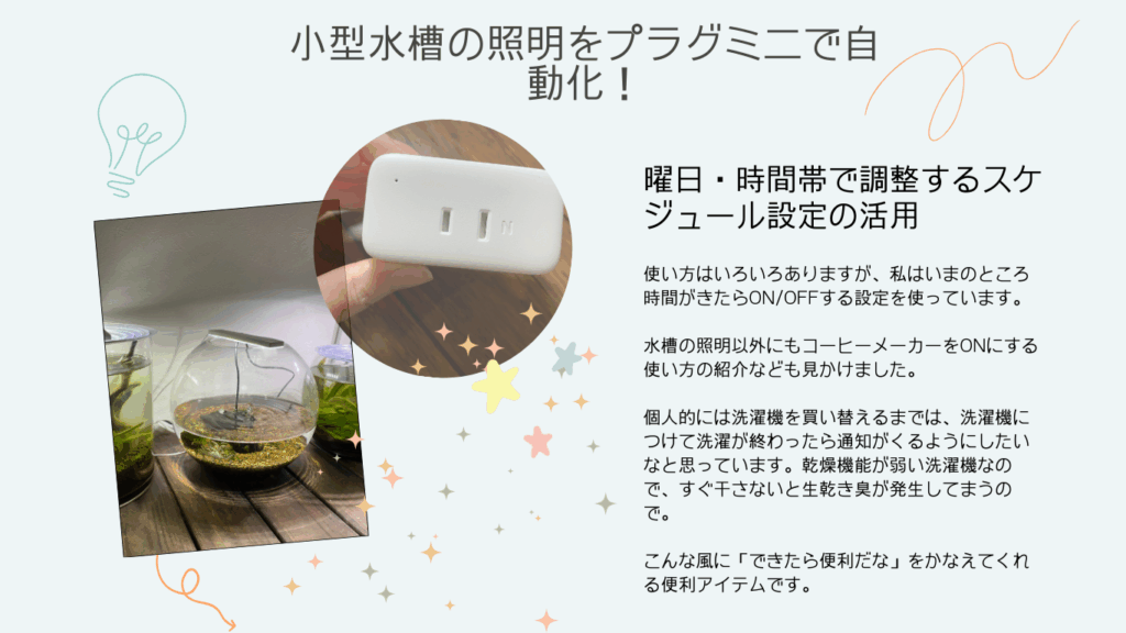 家に水槽がある人などは覚えがあると思うのですが、長時間つけっぱなしにしていると水槽にコケが生えやすくなります。管理が大変になってしまうためこの方法をとっています。朝外出することがあっても決まった時間に照明がついてくれるのでとっても便利です。夜も決まった時間に切れるようにしているのでうっかり消し忘れて一晩中ついていたなんてことはなくなりました。